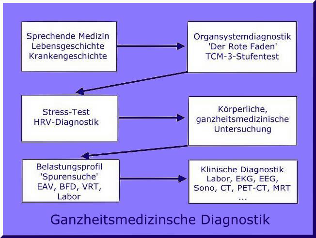 Ganzheitsmedizinische Diagnostik basiert auf einem konsequenten 'sowohl-als-auch', was heißt, nutzen Sie sowohl die Möglichkeiten der herkömmlichen Medizin wie Labor, EKG, EEG, die lokalen bildgebenden Verfahren (Sono, Röntgen, CT, MRT, PET) als auch die umfassenden Möglichkeiten der 'Diagnostischen Akupunkturtestverfahren', die Ihnen die funktionellen organsystemischen Zusammenhänge Ihrer Erkrankung im Testverlauf aufzeigen können. Wer den neurophysiologischen Seele-Körper Beitrag zum persönlichen Krankheitsgeschehen erkennen möchte, sollte auf den Stresstest mittels der Herzfrequenzvariabilität (HRV) nicht verzichten. Auf beiden Beinen steht man besser!