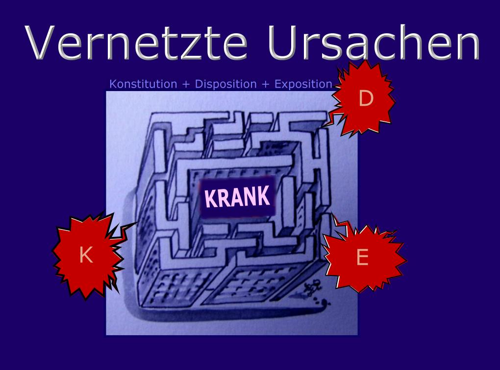Ob wir gesund bleiben oder erkranken, hängt letztlich von unserer individuellen körperlichen Verfassung (Konstitution), von unserer vererbten und erworbenen Empfindlichkeit (Disposition) und von den Einflüssen unserer persönlichen bio-psycho-sozialen Umgebung (Exposition) ab. Ein Zusammenspiel dieser Faktoren ermöglicht erst, zu erkranken. Wer alles nur isolierten Genen, nur einzelnen Viren, nur einem Konflikt anlasten möchte, fast deutlich zu kurz. Komplexe Erkrankungen wie Allergien, Krebs, Autoimmunerkrankungen, Infektionen, Koronare Herzerkrankung verlangen eine komplexe individuelle Spurensuche und Therapie.