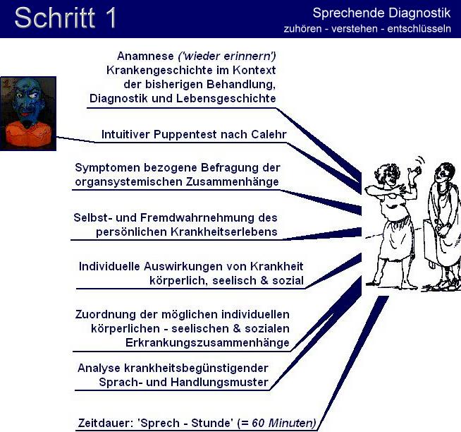 Stufe 1: Die Vor-Ort-Anamnese. Die Erörterung der Krankengeschichte nach den klinischen Zeichen der schulmedizinischen Organerkrankungen. die die Frage zu klären sucht, welche Organe bzw. Gewebe erkrankt sind, seit wann und welche Art von Erkrankung sich dahinter verbirgt