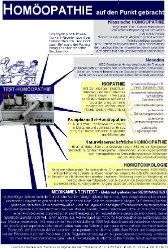 während die 'Klassische Homöopathie' bei der Arzneimittelwahl (Repertorisation) allein auf das geschilderte Beschwerdebild des Patienten und die Erfahrung des Homöopathen beschränkt, überprüft die moderne 'Test-Homöopathie' zusätzlich die Wirksamkeit der repertorisierten Homöopathika über das vernetzte Akupunktursystem vor der Verabreichung. Das erspart Zeit und gibt Sicherheit. Hinzu kommt, daß der Arzneimittelschatz der 'Test-Homöopathie' im Bereich der Isopathie (potenzierte Umweltgifte, Stoffelwechselprodukte und Erreger) dem der 'Klassischen Homöopathie' weit überlegen ist.