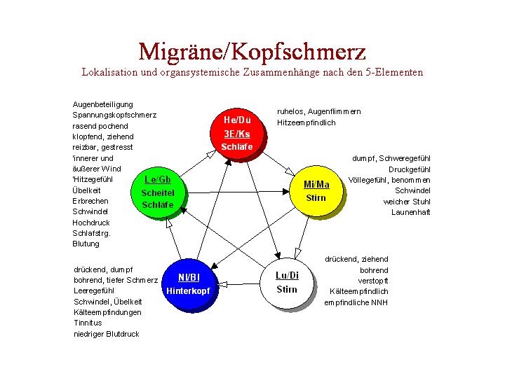 Während die "Schulmedizin" die Migräne mit schmerzunterdrückenden Medikamenten behandelt, ist das Ziel der chinesischen Medizin, über die Wiederherstellung der Regulationsfähigkeit der Organsysteme, die Schmerzen zu beseitigen. Mit Hilfe der ‘Diagnostischen Akupunkturtestverfahren’ lDIAGNOSTIK äßt sich zuerst feststellen, welches funktionsgestörte Organsystem die Migräne bedingt. Aus dem’TCM-3-Stufen-Test’ können spezialisierte Ärzte nicht nur ein individuelles Akupunkturschema für den Patienten erarbeiten (vorbei die Zeit der Rezeptbuchstecherei), sondern auch Ernährungspläne, spezielle Entspannungs- und Atemübungen für den Schmerzpatienten zusammenstellen. Der Patient lernt dabei, etwas für sich selbst zu tun. Im zweiten Schritt werden dann über den ‘Vegetativen Reflextest - VRT’ Belastungen (bakterielle, virale, allergische Belastungen, Umweltgifte, Einfluß von Zahnwerkstoffen usw.) sowie über den Medikamententest die passenden homöopatischen Mittel (Test-Homöopathie) zur Entlastung und Regulationsförderung der Organsysteme über die Akupunkturpunkte am Patienten ausgetestet. Frau K. war erstaunt zu hören, was ihre Migräne mit bestimmten organischen Regulationsstörungen zu tun haben könnte. Die ausgetesteten homöopatischen Medikamente THERAPIE , zusammen mit der Akupunktur und der von der Ärztin durchgeführten lösungsorientierten Gesprächstherapie halfen Frau K. nach elf Monaten die zwanzigjährige Migräne zu überwinden.